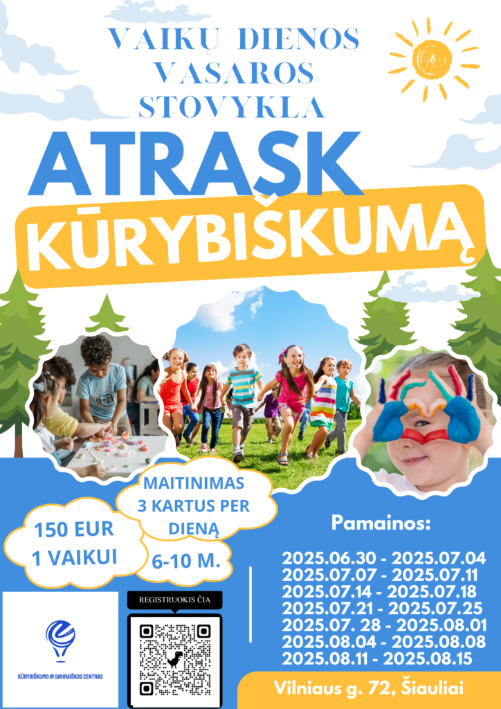 Kviečiame pasirinkti Jums tinkamą VšĮ Kūrybiškumo ir saviraiškos centro vasaros stovyklos pamainą. Dėkojame, kad mumis pasitikite ir renkatės mus.Kviečiame į vaikų vasaros dienos stovyklą „Atrask kūrybiškumą“, su draugiškuoju robotuku Beimaxu – ten, kur vaizduotė neturi ribų! ![]()